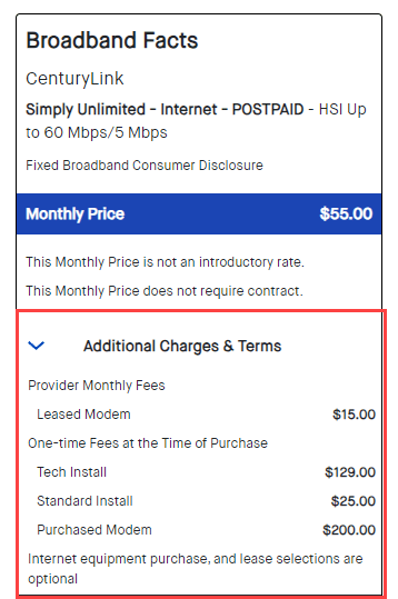 With a purchased modem, you’ll pay a one-time initial equipment fee. With a leased modem, you’ll pay a monthly service charge for the use of our equipment. While both options are listed on the nutrition label for you to compare, you will only be charged for the option you choose.
