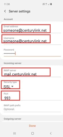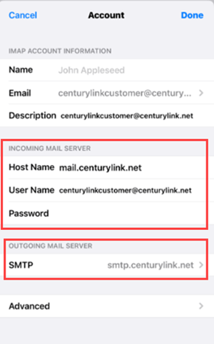 | Incoming Server (IMAP recommended) | IMAP: mail.centurylink.net, Port: 993, Security: SSL POP: pop.centurylink.net, Port: 995, Security: SSL |