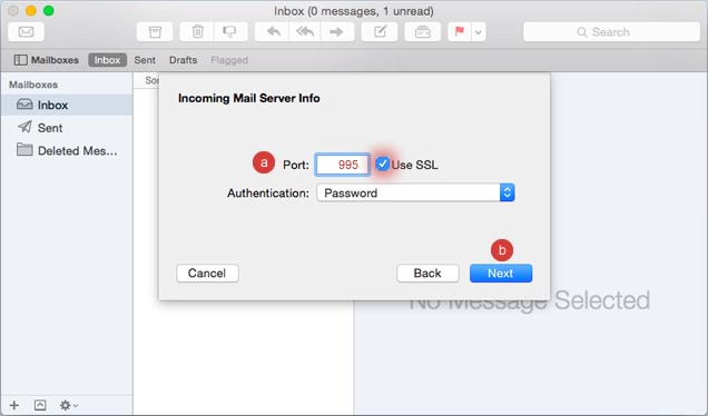 2. Enter 995 for the port and check Use SSL, then select Next.