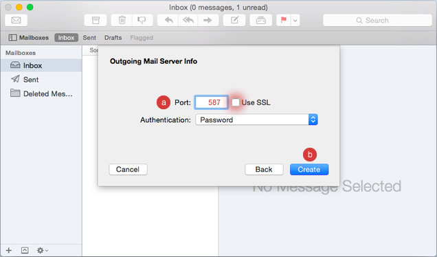 4. Enter 587 for the port and un-check Use SSL, then select Create to finish setup.