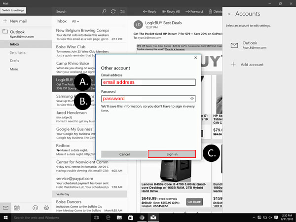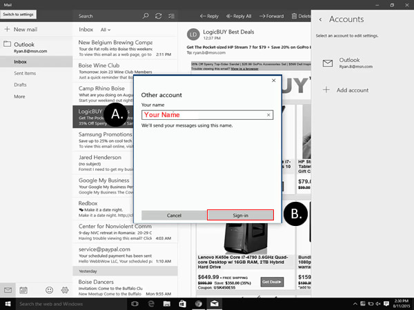 8. Enter your name and select Sign-In.  Windows Mail will try to configure your email settings automatically. If your Inbox says "still working on it" for more than 3 minutes you need to edit your settings.