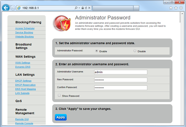The character requirements for a new Administrator Password vary by modem model. You will see a prompt or details if your new password doesn't meet the requirements.