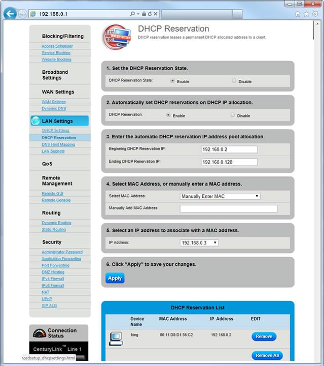 If you are having trouble connecting new devices to your modem, you can go to step 7 below to disable DHCP reservations and remove all devices from the reservation list.