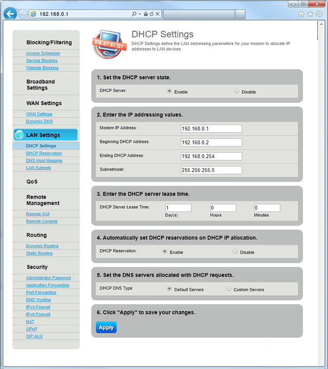 Dynamic Host Configuration Protocol (DHCP) settings allow you to set the parameters for how your modem assigns IP addresses to devices on your network.