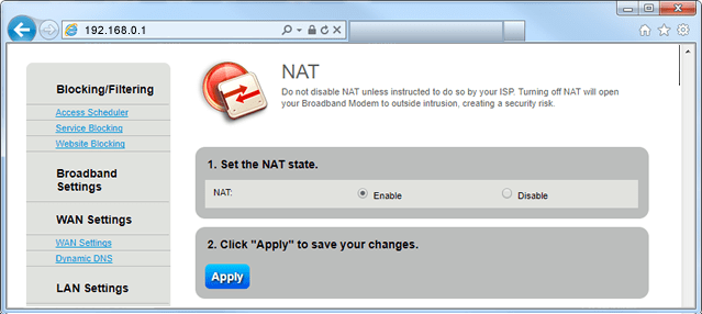 Network Address Translation (NAT) is an advanced networking setting that most people do not use. We advise you not to disable NAT unless instructed to do so by a qualified technician, as it could open your broadband modem to outside intrusion and create a security risk.