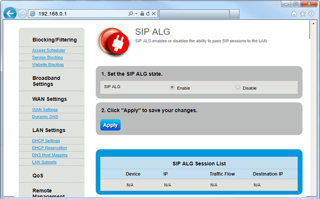 6. Enable/Disable SIP ALG, and click "Apply" to save your changes. You can also view the full SIP ALG Session List at the bottom.