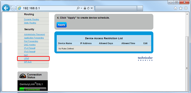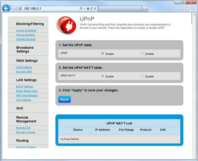 Universal Plug and Play (UPnP) allows devices on the modem network to discover each other and establish sharing and communications. Devices that commonly use UPnP are printers, media servers, IP cameras, smart TVs and gaming systems.