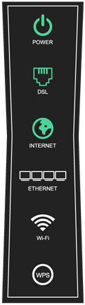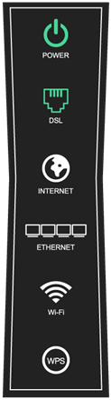 After the phone cord is plugged into the back of the modem and connected to an active wall jack, the modem will search for the DSL signal. Once it connects to our core network, the DSL light will turn solid GREEN. Check the internet light next, or see below if the DSL light does not turn green.