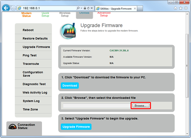 10.  Next, you'll install the firmware file you saved in the previous step by browsing to it. Select Browse on the Upgrade Firmware screen.