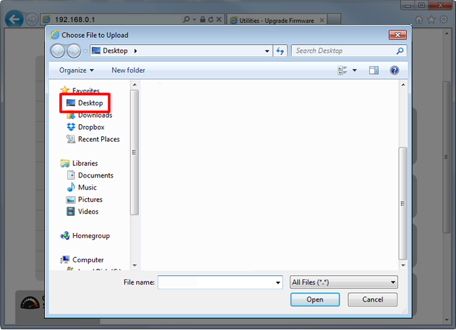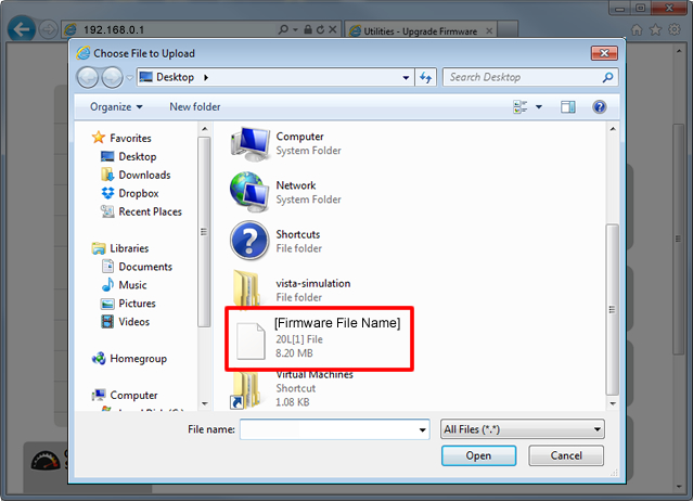 11.  Find the folder on your computer where you saved the file in step 9. Select the firmware file, then click Open