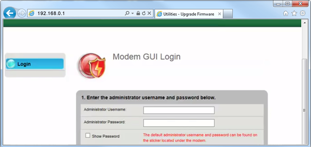15.  Once the upgrade is complete, you will be taken back to the main Modem GUI Login screen. Wait 2-5 minutes for the DSL and internet lights on the modem to turn green before trying to browse to a webpage to test that your connection is good.