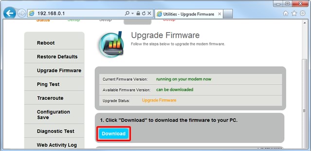7.  To update the firmware, first you'll download the file to your computer. Select Download on the Upgrade Firmware screen.