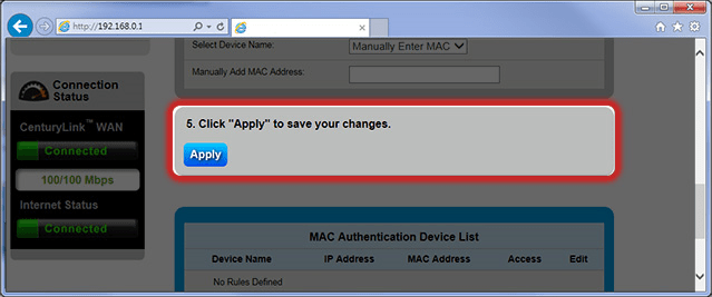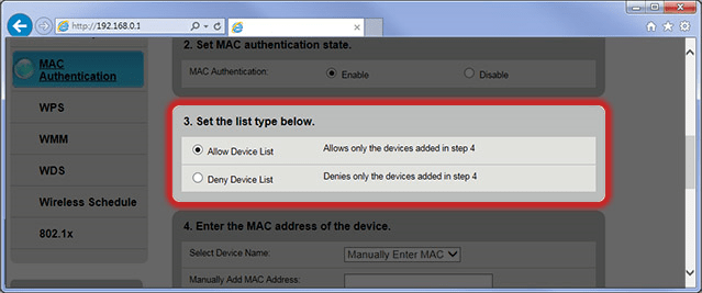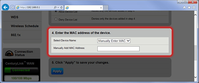 10. Enter the MAC address (or select a device from the drop-down) that you want to allow deny, depending on the "list type" set in step