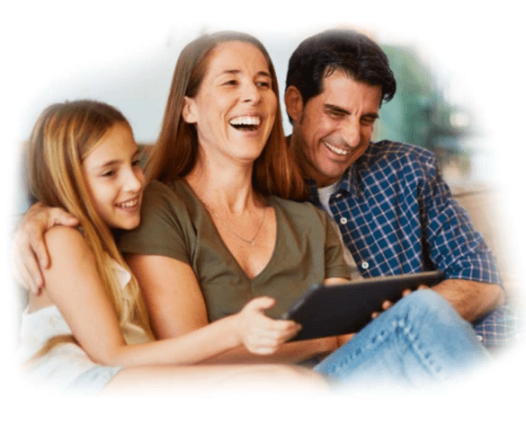 A man, woman, and girl laugh while looking at a tablet