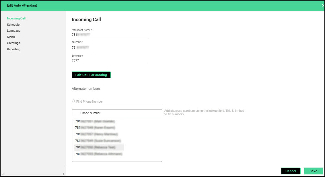 You can assign second or third numbers that act as your main number to your Auto Attendant. These are referred to as alternate numbers. If those numbers are dialed, they’ll ring to the Auto Attendant and callers receive the same message as if they called the main number.