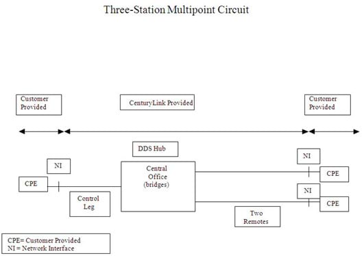 - Multipoint (Bridging) is a bridging arrangement for multipoint circuits. It is available only at selected offices identified in Federal Communications Commission (FCC) No. 4 National Exchange Carrier Association tariff as a "DDS Hub." Additional bridging locations are available in some states (for intrastate applications only) in offices identified as "DDS” Nodes." Multipoint circuits are used to connect three or more stations together into a single DDS circuit. The circuits consist of a single master or control leg and two or more remote legs. The legs are connected together in a DDS Hub by a bridge. Each leg is identified and designed separately. The figure below--Figure 1, "Three Station Multipoint Circuit," illustrates a three-leg (i.e., a three-station) multipoint circuit. The Customer Provided Equipment (CPE) connected to the control leg controls the circuit. The bridge broadcasts the information transmitted by the control station to all remote legs. The control station maintains protocol so that the proper remote station recognizes the incoming information as being for that station. The bridge adds together all information coming upstream from the remote stations and passes the resulting signal on to the master station. The master station's protocol ensures that only one remote station is talking at a time to avoid garble.