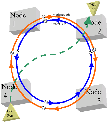 Self-Healing Network Service (SHNS) is a ring that uses Path Protection Switching to substitute standby equipment or facilities when a failure occurs. Information on the primary path on the ring flows in a clockwise direction. On the protect path, it flows counterclockwise.